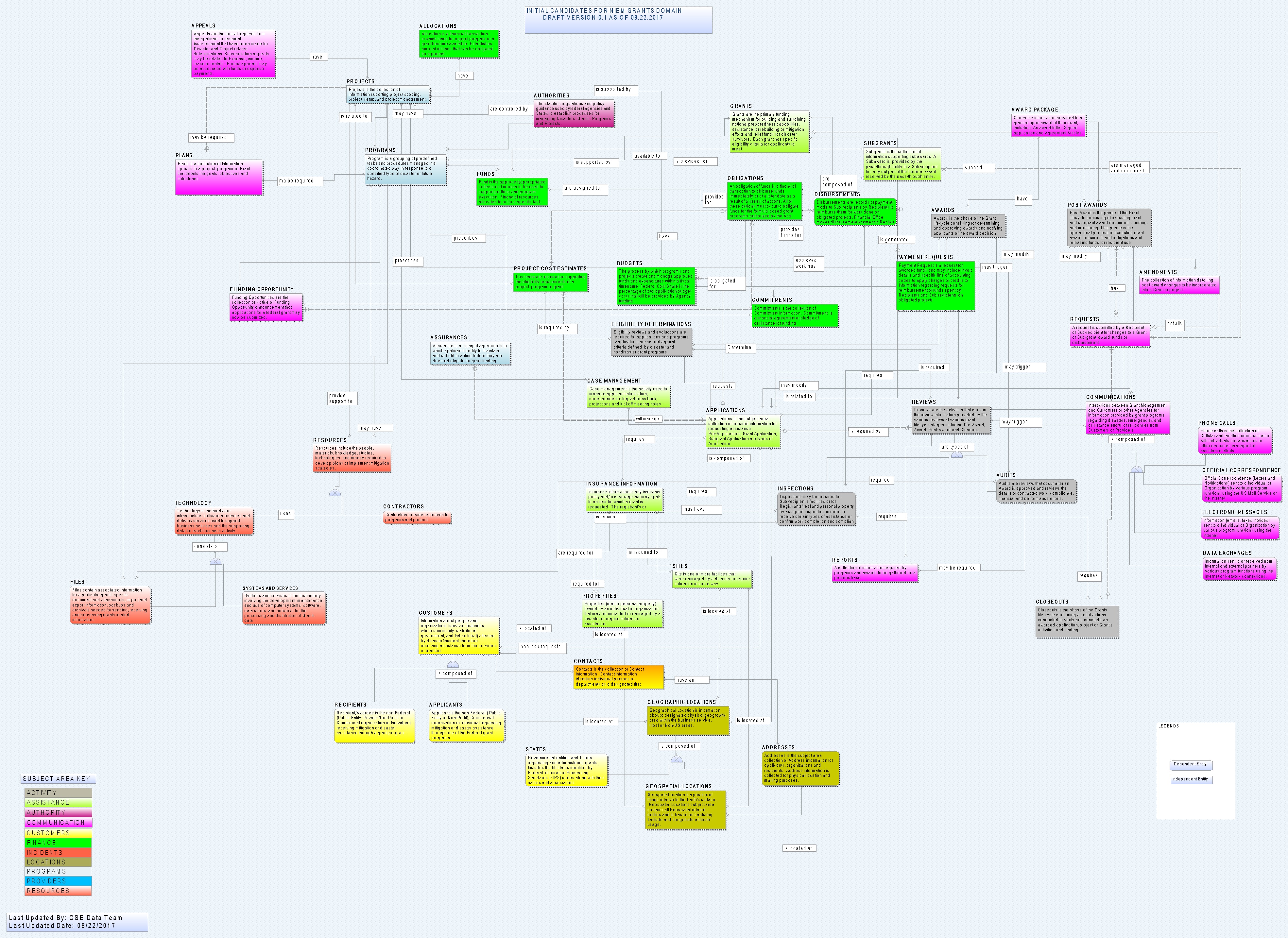 To date, the team has reviewed over 34,000 grant-related data fields scattered across several government systems and narrowed the data fields down to approximately 3,200. This set has been further edited down and categorized into 114 of the most common data subjects. Of the 114 data subjects, some have been down-selected for consideration as common core for grant data.
